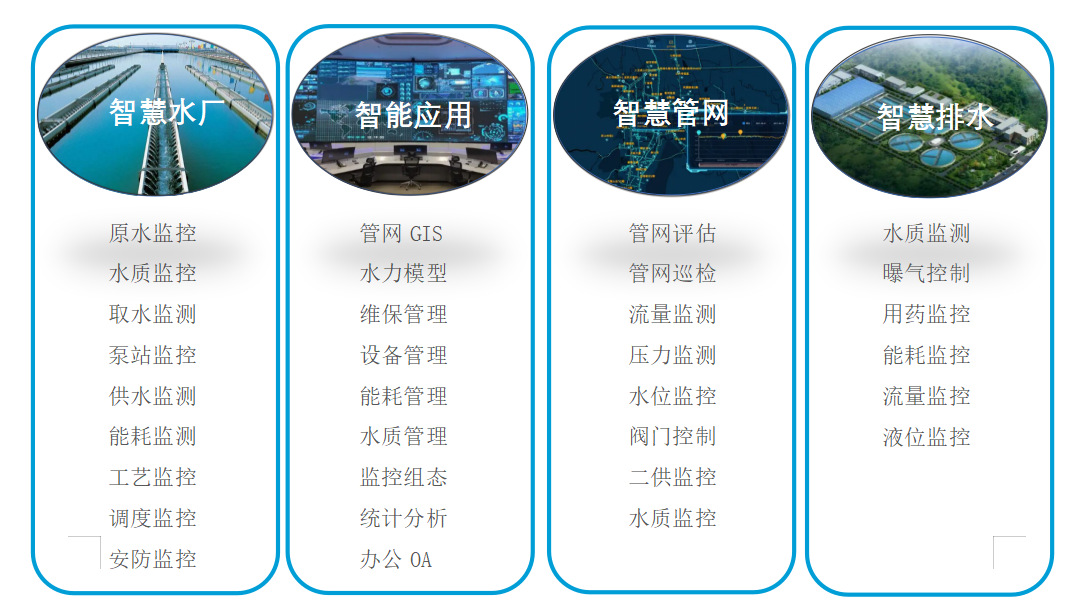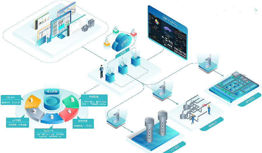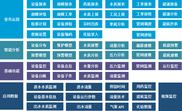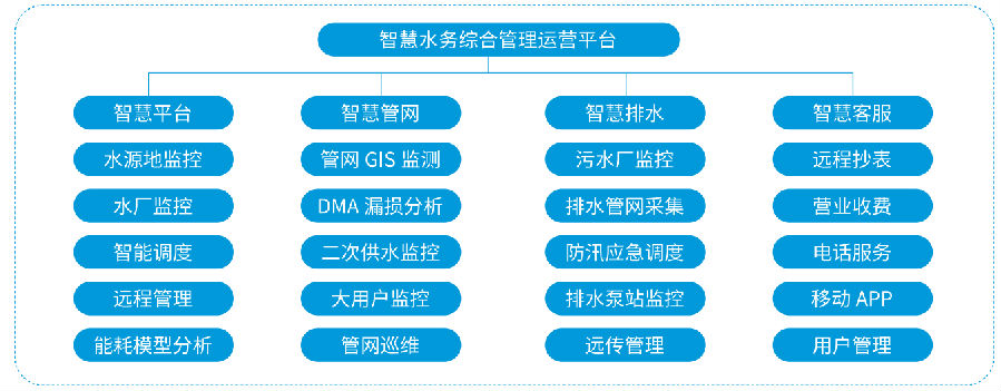 基于供水企业生产运行产生的数据,进行动态数据的采集、整合、管理、共享,构建水务企业物联网数据中心,降低供水企业生产成本,提升供水企业智慧化管理水平,提高水资源利用率和应急调控能力,实现供水企业生产自动化、水压水量监测的现代化、信息资源共享化、管理决策智能化的水务智慧化管理。