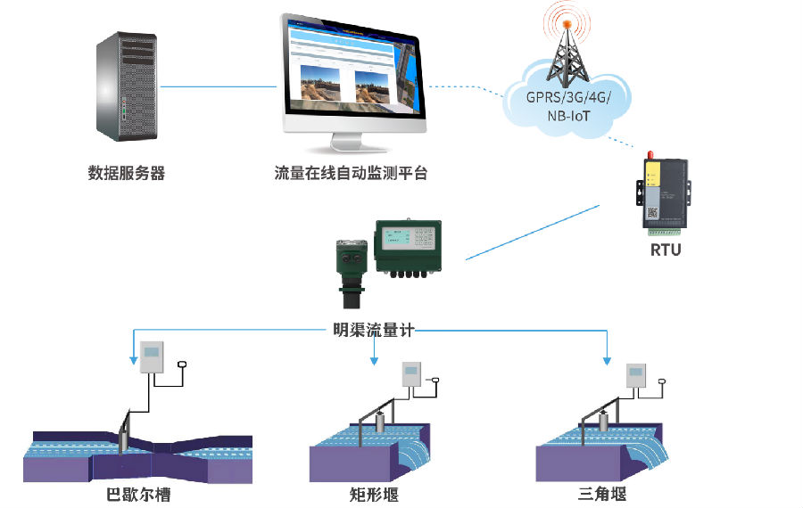 系统主要由现场采集单元、数据处理单元(测量主机)、通信网络和监控中心数据服务平台组成。系统由声学多普勒流量计测量流体流速、水位、水温和流量,遥测终端RTU将数据通过4G/NB-IoT网络传输至流量监测中心,监测中心结合相应的监控及分析软件可实时对现场数据可视化监测,实现系统运行无人值守、有人管理的模式。