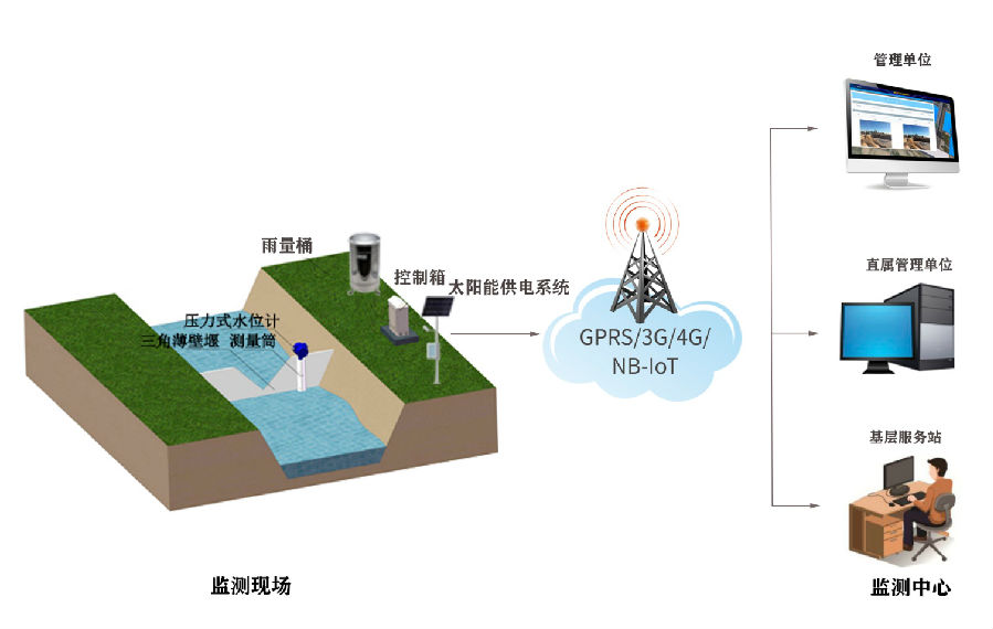 利用GPRS/GSM(或CDMA、4G、光纤)网络将现场数据信息实时发送给监测中心。