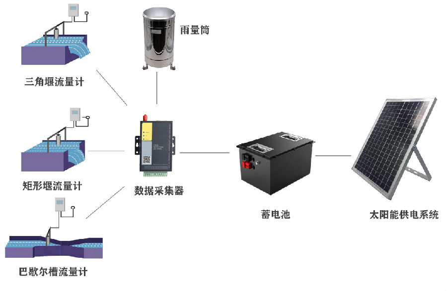 典型渠道流量监测站主要由数据采集终端(RTU)、水位/流量检测设备、雨量检测设备、供电设备及避雷设备等组成。