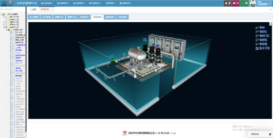 深圳水务集团的二次供水智慧水务管理平台是由其下属的深圳水务科技公司研发。该平台能对二次加压泵房的运行情况进行全天候、多方位的实时监控。实现了二次供水设施的可视化集中管理,集成泵房运行数据、视频、门禁,实现报警安防联动。可通过移动端数据监测、警报处置、巡检工单处理实现泵房移动运维管理,并且可以利用大数据分析泵房运行规律实现设备预测性维护。通过分析用户用水规律实现错峰调蓄,保障高峰用水,平稳管网压力,降低爆管概率。