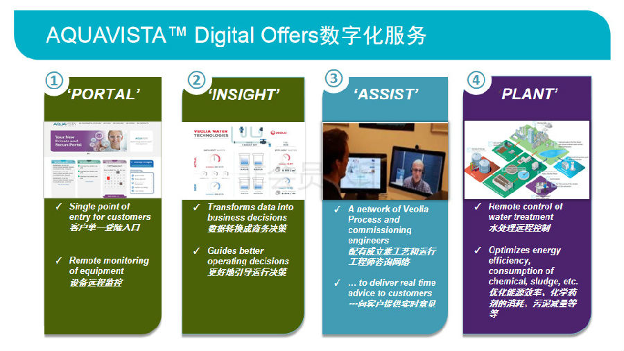 Aquavista是威立雅水务技术推出的全新数字化服务产品。它是一套完整的数字服务,使用物联网、高级数据分析以及威立雅在水处理技术上的专业核心知识,旨在帮助市政及工业客户更好的操作、运行水厂。