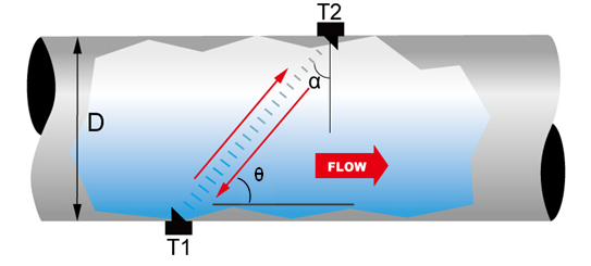 测量时处在上下游的传感器将同时发射超声波脉冲,一个是逆流传播,一个是顺流传播。顺流时的超声脉冲传播速度比逆流时传播的速度要快,由于两束脉冲传播的实际路程相同,传输时间的不同直接反映了流体流速的大小,这两种超声脉冲传播的时间差越大,则流量也越大。